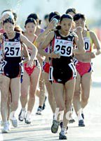 奧運冠軍王麗萍禮讓金牌 老將王妍折桂收山 2001年11月19日 10:59 ![]() 遼寧競走選手王妍(259號)十九日在中國第九屆全運會女子二十公里競走比賽中,以一小時二十六分二十二秒的成績打破亞洲紀(jì)錄并獲得冠軍。中新社記者 毛建軍 攝 ![]() 十九日,遼寧選手王妍在九運會田徑二十公里女子競走決賽中,以一小時二十六分二二的驚人成績打破亞洲紀(jì)錄,奪得該項目金牌。中新社記者 陳文 攝
