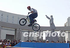 ![]() 極限輪滑選手七日在吉林市世紀(jì)廣場(chǎng)的毛澤東塑像前表演。中新社圖 寧秀英 攝