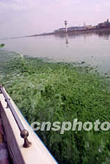 圖:昆明滇池個(gè)別水域綠藻泛濫 2002年07月16日 19:27 ![]() 昆明滇池個(gè)別水域最近綠藻泛濫,污染嚴(yán)重?焱я傔^時(shí)激起綠色的浪花,臭氣熏天。中新社記者 史利 攝