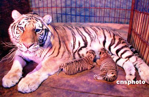 | 12月6日上午,浙江省溫嶺動(dòng)物園里頭一回產(chǎn)仔當(dāng)媽媽的3歲半的東北虎吉吉正在給兩只虎崽喂奶。12月4日晚上6時(shí)許,懷胎剛110天的東北虎吉吉開始生產(chǎn),在1個(gè)半小時(shí)內(nèi)共產(chǎn)崽3只,其中1只產(chǎn)下當(dāng)時(shí)就夭折,只留下龍鳳胎虎崽,整個(gè)生產(chǎn)過程全靠勇敢的虎媽媽吉吉自己完成。工作人員只能在虎產(chǎn)房外通過電視監(jiān)控觀看老虎生崽的情景。每只虎仔的體重均為1375克,體長(zhǎng)為30厘米。每天24小時(shí)工作人員均在虎產(chǎn)房外輪流值班,呵護(hù)著吉吉母子們。 作者:江勇兵
