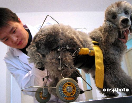 | 12月13日上午,一只受傷的寵物犬坐上特制的輪椅,在兩個月的養(yǎng)傷時間內(nèi),它就可以自由活動覓食了。據(jù)介紹,這只貴婦犬前幾天被一輛摩托車軋斷左后腿,由于這只貴婦犬太頑皮,經(jīng)常拖著包扎好傷腿到處跑,影響傷勢恢復(fù)。為防止感染,寵物醫(yī)生為其臨時制作了一個小輪椅,將小狗兩條后腿固定在輪椅上?績蓷l前腿的力量,小狗就能自由活動。作者:趙健鵬