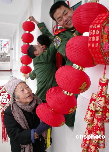 | 2006年1月24日,浙江省溫嶺市林文錦老媽媽被消防官兵接到部隊(duì)駐地過春節(jié)。林文錦老人早年喪夫,惟一的女兒又癱瘓遠(yuǎn)在蘇北,晚年生活孤單無助。武警溫嶺市消防中隊(duì)官兵得知情況后承擔(dān)起照料林老媽媽的責(zé)任。逢年過節(jié),官兵們惦記著老人,把她接到部隊(duì)會餐共度佳節(jié),使老人晚年生活不再冷清。作者:江勇兵
