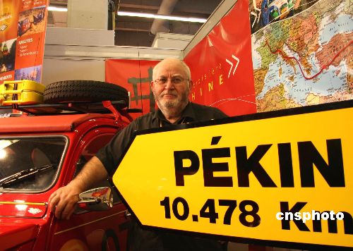 | 2月16日,法國(guó)老爺車(chē)協(xié)會(huì)的一位老爺車(chē)迷于站在巴黎鮮紅的雪鐵龍車(chē)旁,身旁路牌標(biāo)示抵達(dá)“北京10478公里”,身后展臺(tái)巨大的地圖上用紅線標(biāo)出從巴黎到中國(guó)首都北京的往返路線!胺▏(guó)2006年老爺車(chē)展”刻下正在巴黎舉行,為紀(jì)念1907年北京-巴黎汽車(chē)馬拉松賽百年,一個(gè)名為“勇敢者遠(yuǎn)足”的法國(guó)老爺車(chē)協(xié)會(huì)在展覽上亮出“2007北京”的旗號(hào),計(jì)劃重走百年前的老路。據(jù)悉將有200多人、100多輛汽車(chē)和摩托車(chē)參加這次非同尋常的中國(guó)之旅,因往返路線不同,行程會(huì)超過(guò)27000公里。作者:鐘誠(chéng)