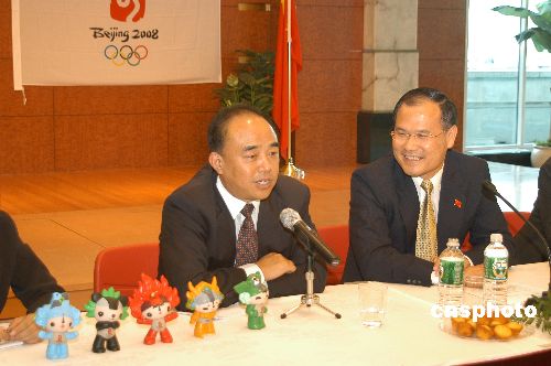 當(dāng)?shù)貢r(shí)間九月二十二日,北京奧組委新聞宣傳部副部長(zhǎng)邵世偉(左)在紐約總領(lǐng)館介紹相關(guān)情況。中國(guó)駐紐約總領(lǐng)事劉碧偉(右)表示,廣大海外僑胞十分關(guān)心北京奧運(yùn),是北京奧運(yùn)的海外“啦啦隊(duì)”。