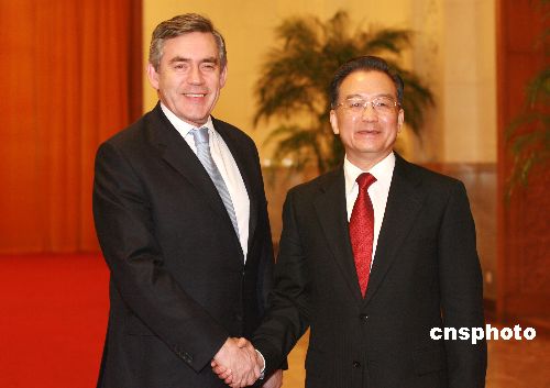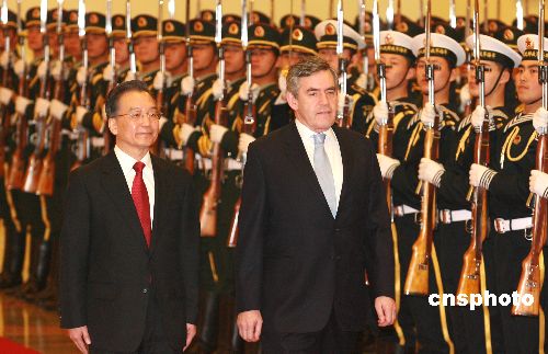 一月十八日,中國國務院總理溫家寶在北京人民大會堂主持儀式歡迎英國首相戈登·布朗訪華。中新社發(fā) 廖文靜 攝