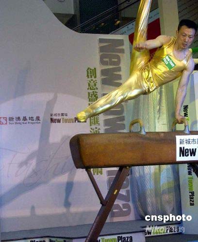 四月三十日,沙田一商場為慶祝奧運(yùn)馬術(shù)比賽在香港舉行,特別邀請亞特蘭大奧運(yùn)會鞍馬冠軍李東華作表演。李東華作為瑞士2008年奧運(yùn)會國家代表團(tuán)的特使,為瑞士贏得近百年來的首枚體操奧運(yùn)金牌。中新社發(fā) 譚達(dá)明 攝