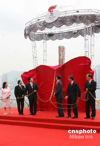 圖為香港政務(wù)司司長(zhǎng)唐英年(右三)、北京奧組委執(zhí)行副主席楊樹安(左三)、香港體育協(xié)會(huì)暨奧委會(huì)會(huì)長(zhǎng)霍震霆(左二)等出席火炬雕塑揭幕儀式。