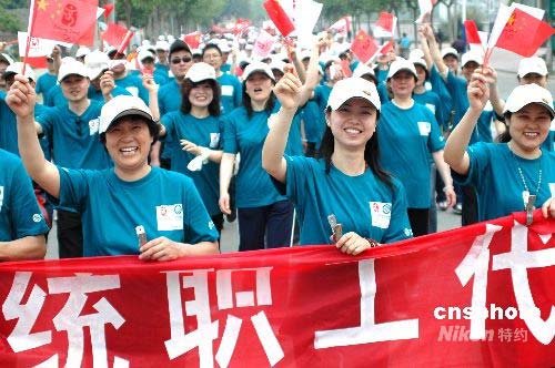 4月30日,安徽省蕪湖市舉行聲勢浩大的企業(yè)職工歡慶奧運(yùn)倒計(jì)時(shí)100天健身行喜迎“五一”國際勞動(dòng)節(jié)活動(dòng),數(shù)千人參與游行隊(duì)伍行列。中新社發(fā) 陳立希 攝
