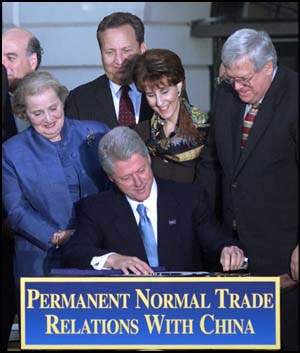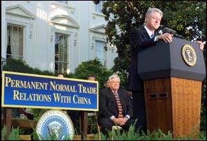 圖文:克林頓簽署PNTR法案 2000年10月11日 11:35 克林頓在多名曾為PNTR法案不斷努力的官員陪同下,正式簽署PNTR法案,為中美關(guān)系邁入一個歷史性的新里程。 克林頓在總統(tǒng)任期內(nèi)完成心愿,簽署PNTR法案,他形容這是他在任期內(nèi)的一大勝利。(圖據(jù)外電) 中新社華盛頓十月十日電(記者徐德金)美國總統(tǒng)克林頓今天下午在白宮南草坪舉行儀式,簽署了對華永久性正常貿(mào)易關(guān)系(PNTR)法案。由此,這項已在國會眾議院、參議院通過的法案成為法律,正式生效。 白宮說,克林頓簽署PNTR法案是美中關(guān)系的歷史性時刻,中國將向美國的商品與服務(wù)業(yè)打開市場,加強美中關(guān)系。 中、美兩國政府于去年十一月十五日在北京簽署關(guān)于中國加入世界貿(mào)易組織的雙邊協(xié)議,這份被稱作“雙贏”的協(xié)議,促進(jìn)了中美兩國經(jīng)貿(mào)關(guān)系,也加快了中國邁向WTO的進(jìn)程。 今年三月,克林頓向國會提交了一項關(guān)于給予中國永久性正常貿(mào)易關(guān)系地位的立法建議。此后數(shù)月,克林頓及美國聯(lián)邦政府高級官員不斷呼吁、敦促國會,盡早審議、通過PNTR案。今年五月二十四日,眾議院以二百三十七票對一百九十七票批準(zhǔn)了PNTR案;九月十九日,參議院又以八十三票對十五票的壓倒性多數(shù)通過了該案。 該法案生效后,將結(jié)束二十年來美國國會每年審議一次對華“正常貿(mào)易關(guān)系”(一九九八年前叫“最惠國待遇”)的歷史,與中國建立永久正常貿(mào)易關(guān)系。實現(xiàn)美對華永久正常貿(mào)易關(guān)系符合世貿(mào)組織的規(guī)定,符合中美兩國人民的根本利益,有利于推動中美經(jīng)貿(mào)合作和中美關(guān)系繼續(xù)向前發(fā)展。 不過,人們注意到克林頓今天簽署的法案,包含了干涉中國內(nèi)政、損害中國利益的內(nèi)容。中方已向美方表明了堅決反對的嚴(yán)正立場。 美國方面稱,過去二十年,美中貿(mào)易已從無關(guān)緊要的水平提高到每年增長一百四十億美元的水平。今后,美國產(chǎn)品將更容易進(jìn)入一個超過十二億人口的市場。 (完) |