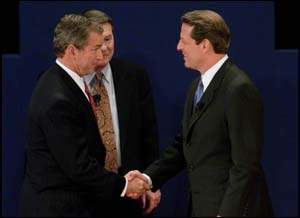 圖文:美國總統(tǒng)候選人展開第二場辯論 2000年10月12日 16:16 ![]() 距離11月7號(hào)的大選不足4周,戈?duì)?右)與小布什(左)再度在電視辯論上交鋒。兩人在開始交戰(zhàn)時(shí),先握手示好。 中新網(wǎng)北京10月12日消息:美國民主黨總統(tǒng)候選人、現(xiàn)任副總統(tǒng)戈?duì)枺c共和黨總統(tǒng)候選人、得州州長布什,已經(jīng)在美東時(shí)間周三晚9時(shí)展開他們的第二場辯論。 這次辯論在北卡羅萊納州的WakeForest大學(xué)舉行,并仍然由公共電視臺(tái)(PBS)的萊勒主持。 這次辯論的方式將不同于第一次。兩位總統(tǒng)候選人采取隨意的談話方式,坐下來回答主持人的提問。這正是布什所擅長的方式。每人有2分鐘的時(shí)間回答提問,在辯論結(jié)束時(shí),有2分鐘的時(shí)間作結(jié)束演講。 估計(jì)兩人會(huì)繼續(xù)就政府角色和架構(gòu)針鋒相對(duì),但中東和平和南斯拉夫局勢等外交問題也會(huì)是辯論的議題之一。 戈?duì)柌际驳牡谝粓鲛q論已于本月3日晚進(jìn)行,原來預(yù)期多達(dá)7,500萬民眾收看首場辯論。但實(shí)際上只有4,600萬人收看了第一場辯論。 首場辯論會(huì)結(jié)束后,美國各大媒體做的民調(diào)顯示,民眾認(rèn)為戈?duì)柕谋憩F(xiàn)略勝布什一籌,但戈?duì)栁茨軘U(kuò)大領(lǐng)先布什的優(yōu)勢。首場辯論對(duì)選民并未產(chǎn)生預(yù)期的影響,民調(diào)表明,在首場辯論后,仍然有超過22%的選民心意未決。(圖文據(jù)外電) |