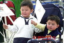 弟十六日隨家長參加慶;貧w一周年的活動時,揮舞支持北京申辦奧運會的小旗。中新社傳真 宗金柱攝