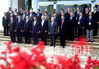 中國國家主席江澤民二十六日在海南博鰲水城集體會見出席亞洲論壇的貴賓,并在鮮艷的紅花叢前,與這些亞洲國家的前政要們和論壇秘書長合影。中新社記者 賈國榮 攝