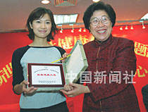大陸正在走紅的女演員徐靜蕾,因其良好的社會聲譽(yù)和健康的形象,八日被全國婦聯(lián)授予“健康大使”。圖為全國婦聯(lián)副主席沈淑濟(jì)(右)向徐靜蕾授“健康大使”牌。中新社記者 王麗南 攝