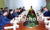 二○○一年APEC貿(mào)易部長會(huì)議將于六月六日開幕。會(huì)議主席、中國外經(jīng)貿(mào)部部長石廣生和中國代表團(tuán)團(tuán)長、外經(jīng)貿(mào)部首席談判代表龍永圖,五日在上海國際會(huì)議中心與經(jīng)濟(jì)體代表團(tuán)團(tuán)長舉行雙邊會(huì)談。圖為石廣生與美國貿(mào)易談判代表羅伯特·佐立克一行會(huì)晤。中新社記者 潘索菲 攝