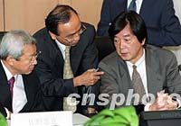 日方代表團團長田中均(右)七月三日在北京就中日貿(mào)易磨擦問題與中方進行正式磋商。圖為田中均與佐野忠克等人談判前交換意見。中新社記者 鄒憲 攝