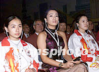7月13日,國際奧委會112次會議在莫斯科世界貿(mào)易中心舉行會議,表決2008年奧運(yùn)會舉辦城市。圖為北京申奧代表員成員們劉璇、鞏俐、王楠(左至右)到場聆聽北京代表團(tuán)陳述報(bào)告。中新社記者 王瑤 攝
