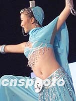 正在青島舉行的戴安娜2001世界精英模特大賽中國預(yù)選賽暨金沙灘模特大賽上,模特選手不僅要具有美妙的身材,還要多才多藝。圖為一名選手表演新疆舞。中新社記者 錢興強(qiáng) 攝
