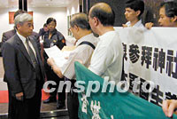 圖:香港團(tuán)體游行,抗議日本首相參拜靖國神社 2001年08月15日 20:32 ![]() 香港多個團(tuán)體15日舉行示威游行,抗議日本首相小泉純一郎參拜靖國神社。圖為香港教聯(lián)會向日本駐港總領(lǐng)事館遞交抗議信函。 中新社圖 盧峰 攝