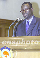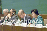 ![]() 聯(lián)合國環(huán)境規(guī)劃署官員巴克利·肯特四日在北京出席“21世紀(jì)論壇-綠色與環(huán)保2001年會議”,并作演講。中新社記者 滿會喬 攝 ![]() “21世紀(jì)論壇-綠色與環(huán)保2001年會議”四日在北京開幕,全國政協(xié)副主席葉選平(左一)、宋。ㄗ蠖⒅袊謽I(yè)科學(xué)研究院院長江澤慧(右一)等出席開幕式。中新社記者 滿會喬 攝