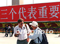 圖:北京天安門廣場(chǎng)掛起“三個(gè)代表” 2001年09月22日 10:56 ![]() 十·一前夕,外國游客在北京天安門廣場(chǎng)游覽。在他們身后是為慶祝中國建國五十二周年而掛起的“認(rèn)真學(xué)習(xí)全面貫徹三個(gè)代表重要思想”的橫幅。中新社圖 張宇 攝