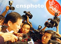APEC快遞:李榮融說,中國經(jīng)濟繼續(xù)快速增長 2001年10月17日 22:48 ![]() 中外記者十月十七日在上海圍住中國國家經(jīng)貿(mào)委主任李榮融,APEC國際新聞中心邀請他介紹中國經(jīng)濟與國企改革以及新近的美國考察之行,引起媒體的關注。中新社記者 賈國榮 攝