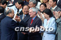 ![]() 中國(guó)加入WTO議定書簽字儀式于北京時(shí)間12日凌晨在多哈舉行,石廣生部長(zhǎng)簽字后同各國(guó)代表一起舉杯慶祝中國(guó)成為WTO大家庭中的一員。中新社記者 錢興強(qiáng) 攝 ![]() 中國(guó)加入WTO議定書簽字儀式于北京時(shí)間12日凌晨在多哈舉行,石廣生部長(zhǎng)簽字后與代表握手致意。中新社記者 錢興強(qiáng) 攝