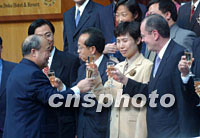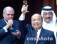 ![]() 中國(guó)加入WTO議定書簽字儀式于當(dāng)?shù)貢r(shí)間11日晚在多哈舉行,石廣生部長(zhǎng)簽字后與在場(chǎng)人士舉杯互致祝賀。中新社記者 錢興強(qiáng) 攝 |