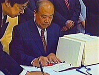 組圖:中國(guó)加入WTO議定書簽字儀式 2001年11月12日 02:07 ![]() 中國(guó)代表團(tuán)團(tuán)長(zhǎng)石廣生于當(dāng)?shù)貢r(shí)間11日晚在多哈簽署中國(guó)入世議定書。中新社記者 錢興強(qiáng) 攝 ![]() 中國(guó)代表團(tuán)團(tuán)長(zhǎng)石廣生于北京時(shí)間十二日零點(diǎn)許在卡塔爾首都多哈喜來(lái)登飯店簽署中國(guó)加入世貿(mào)組織議定書。中新社圖