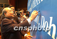 圖:石廣生簽名留念 2001年11月12日 02:45 ![]() 石廣生部長(zhǎng)于北京時(shí)間12日在多哈簽署中國(guó)入世議定書(shū)后,在會(huì)場(chǎng)橫幅上簽名留念,記錄下這一歷史時(shí)刻。中新社記者 錢(qián)興強(qiáng) 攝 |