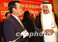 圖:WTO總干事對(duì)中國(guó)臺(tái)北加入世貿(mào)組織表示祝賀 2001年11月13日 10:08 ![]() 第四屆WTO部長(zhǎng)級(jí)會(huì)議十二日在多哈舉行中國(guó)臺(tái)北加入世貿(mào)組織議定書(shū)簽字儀式。圖為會(huì)議主席卡塔爾財(cái)政、經(jīng)濟(jì)和貿(mào)易大臣卡邁爾,WTO總干事穆?tīng)柕认蚺_(tái)北代表團(tuán)團(tuán)長(zhǎng)林信義表示祝賀。中新社記者 錢(qián)興強(qiáng) 攝 |