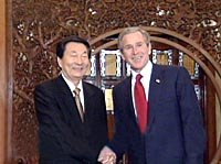 中國國務院總理朱镕基二十二日在北京釣魚臺國賓館會見來訪的美國總統(tǒng)布什。