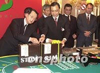 組圖:澳門博彩股份有限公司正式接手11間賭場(chǎng) 2002年04月02日 16:14 ![]() 澳門博彩股份有限公司一日凌晨正式接手經(jīng)營(yíng)澳門旅游娛樂有限公司屬下的十一間賭場(chǎng),新的博彩合約正式生效。圖為兩家公司于零點(diǎn)時(shí)分在賭場(chǎng)交接。中新社記者 宗金柱 攝