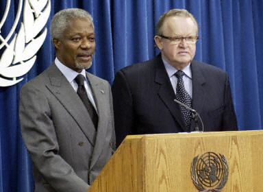 聯(lián)合國秘書長安南任命杰寧難民營真相調(diào)查團(圖) 2002年04月23日 09:47 聯(lián)合國秘書長安南與芬蘭前總統(tǒng)阿赫蒂薩里在新聞發(fā)布會上。(法新圖) 中新網(wǎng)北京4月23日消息:聯(lián)合國秘書長安南星期一說,芬蘭前總統(tǒng)阿赫蒂薩里將率領(lǐng)調(diào)查團,前往西岸巴勒斯坦城市杰寧的難民營。 據(jù)德新社報道,安南表示這是根據(jù)聯(lián)合國安理會的決議作出的決定。安理會上周對美國的提議進行表決,決定向杰寧難民營派出調(diào)查團,調(diào)查有關(guān)以色列制造屠殺的指控。 聯(lián)合國前難民事務專員日本人緒方貞子和國際紅十字會前主席瑞士人索馬魯加都將參加這個調(diào)查團,退役的美國將軍威廉·納什和曾經(jīng)領(lǐng)導過駐波斯尼亞聯(lián)合國警察部隊的愛爾蘭人菲茨杰拉德將擔任調(diào)查小組的軍事顧問。 安南表示:“這個小組的成員都是經(jīng)驗豐富,具有較高水準的專業(yè)人士。我需要有一個具有獨立意志的調(diào)查小組!