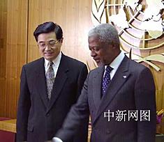 圖:胡錦濤與聯(lián)合國秘書長安南會晤 2002年04月30日 08:42 ![]() 美國東部時間四月二十九日下午,中國國家副主席胡錦濤一行在首次對美國進(jìn)行正式訪問期間,來到紐約聯(lián)合國總部,與聯(lián)合國秘書長安南會晤。中新社記者 陳建 攝