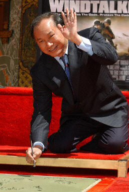 圖:中國香港著名導(dǎo)演吳宇森留印好萊塢 2002年05月22日 12:53 5月21日,中國香港著名導(dǎo)演吳宇森在美國影城好萊塢的“中國戲院”前的水泥地板上印上了自己的手印和足印。法新供中新