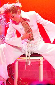 據(jù)此間新明日報的報道說,在幾乎滿座的情況下,梅姐載歌載舞,散發(fā)了無窮的熱力。在前半場的表演,梅艷芳猶如展現(xiàn)服裝秀,鱷魚皮大衣,紅色鉆石晚裝等一一亮相于舞臺,另外,就像過去那樣,她的舞臺動作也極盡大膽,在演唱《憑什么》,把麥克積遜的經(jīng)典舞臺動作重演一遍,雙手在身體敏感部位游動及觸摸,讓人看了臉紅耳赤。
