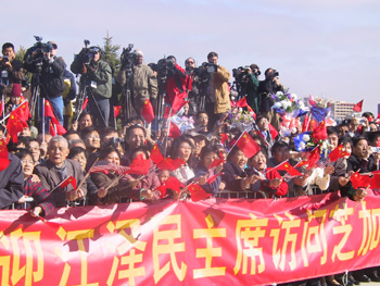 中資機構(gòu)和當(dāng)?shù)厝A人華僑、留學(xué)生代表數(shù)百人到機場歡迎江主席一行 中新社記者 呂振亞 攝