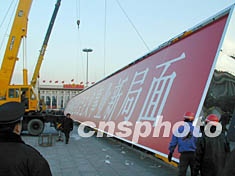 組圖:天安門廣場(chǎng)吊裝巨型標(biāo)語牌的新景觀