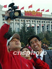 為迎接中共“十六大”召開,天安門廣場(chǎng)布置一新,廣場(chǎng)日前將巨型燈箱標(biāo)語牌吊裝完成。一名青年十一月初在北京天安門攝像時(shí),吸引好奇的旁觀者爭(zhēng)睹廣場(chǎng)新景。作者:張煒