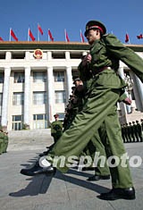 一隊(duì)解放軍戰(zhàn)士四日在北京人民大會(huì)堂前進(jìn)行隊(duì)列練習(xí),迎接即將召開的中國(guó)共產(chǎn)黨第十六次全國(guó)代表大會(huì)。作者:毛建軍