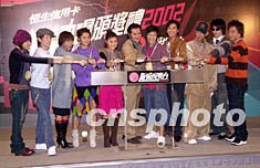 眾年輕偶像候選歌星11月4日在香港出席“新城勁爆頒獎禮2002記者會”。新城電臺行政總裁甘國亮(中)與角逐“新城勁爆人氣歌手”最強五男五女之歌手主持揭幕儀式。鄧慶樂 攝