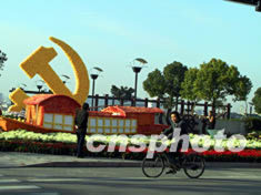 金秋菊展是浙江寧波鎮(zhèn)海傳統(tǒng)的盛大展會。喜迎中共“十六大”的主題則是今年菊展的一大看點。圖為正在當(dāng)?shù)匮亟G地上展出的“南湖紅船”景點。作者:崔煜芳