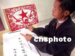 浙江省天臺縣雷峰鄉(xiāng)潘岙楊村58歲農(nóng)民楊美觀創(chuàng)作了一幅寫有“向十六大代表致敬,全國人民心向黨”的“喜迎十六大”的剪紙。11月6日,他特意趕到天臺郵政局,將這一剪紙寄給黨中央,表達一個老農(nóng)民的愛黨之心。丁必裕 攝