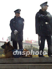 十一月六日,在中共十六大代表陸續(xù)抵達北京時,北京天安門通過地下通道進入廣場的人員都需通過警犬檢查。作者:廖文靜