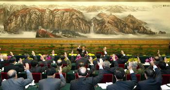 會(huì)議首先在大會(huì)秘書長(zhǎng)胡錦濤主持下,以舉手表決方式通過了由江澤民同志等32人組成的主席團(tuán)常務(wù)委員會(huì)名單。