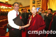 出席中國共產(chǎn)黨第十六次全國代表大會的熱地代表(左),八日在北京人民大會堂向特邀參加會議的十一世班禪額爾德尼.確吉杰布問候致意。作者:毛建軍