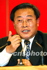 中華全國(guó)總工會(huì)副主席張俊九和中國(guó)社會(huì)勞動(dòng)保障部部長(zhǎng)張左已十一日在中共十六大新聞中心舉行新聞發(fā)布會(huì)。張俊九回答記者提問(wèn)。毛建軍 攝