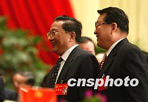 賈慶林和黃菊十四日在北京出席中共十六大的閉幕會。作者:毛建軍