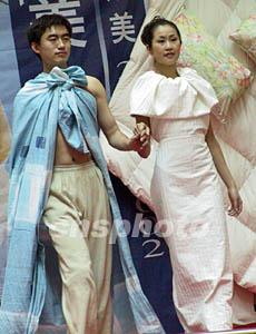 二十日,北京王府井的一家商場內(nèi),模特穿著用被子和床單制作的婚紗進(jìn)行表演,為該品牌的床上用品促銷。作者:盛佳鵬