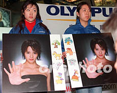 香港歌星梁詠琪今年在北京成為奧林巴斯商家代言人。二十九日,兩位北京小姐在翠微商廈手捧梁詠琪的兩幅細(xì)微差異肖像請顧客辨認(rèn),優(yōu)勝者可以獲獎(jiǎng)。作者:鄒憲